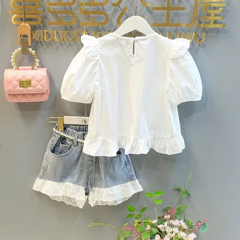 Conjunto Infantil Feminino Branco e Jeans Rendinha